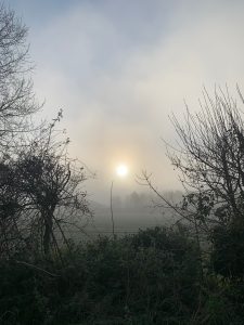Transfixed by the fog. Is it fog or is it mist? What do those words mean? It seems still and unchanging, but every time I look back to a place that was once just white glow, something has appeared. The broken line of a hedgerow – bushes, trees and gaps. Or the angular lines of a modern farm building unseen before.